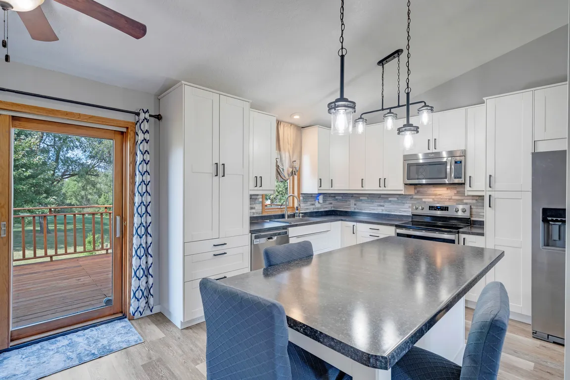 Versatile living spaceLarge updated kitchenCovered patioLarge deckBeautiful fire pit areaSpacious dining room