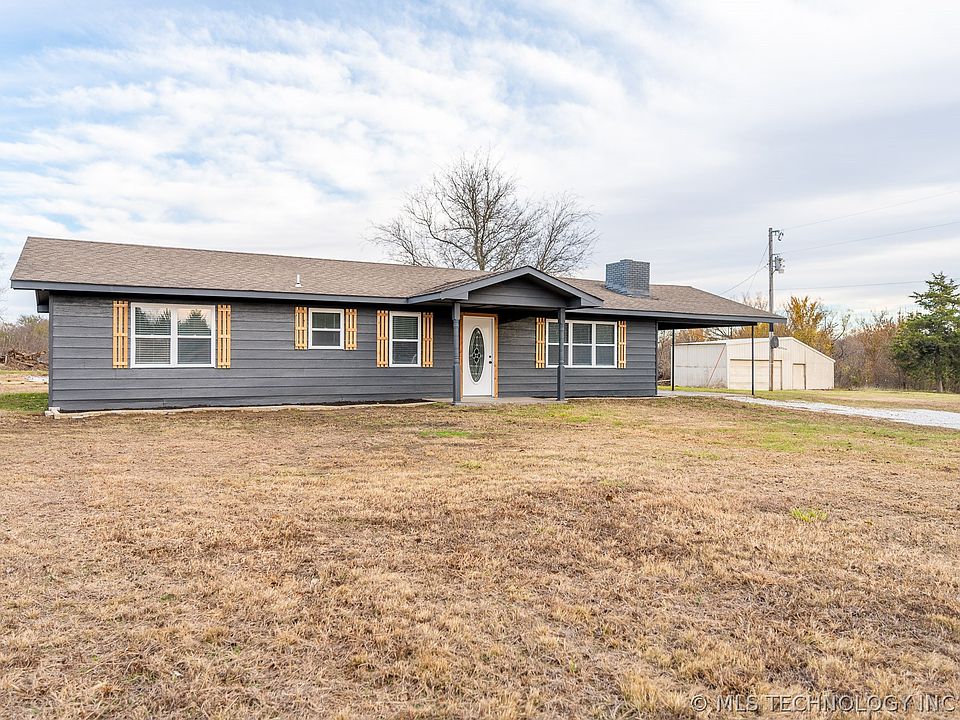 Modernized Ranch Style Home with Shop Building on 1.5 Acres! Property features: open living room with wood burning fireplace, updated kitchen, spacious bedrooms, brand new bathrooms, new flooring throughout, new smart siding, soffit, and fascia, new breaker box, attached carport, huge yard, and much more!