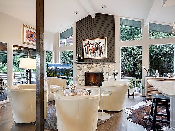 Wide open and bright home with vaulted ceilings, walls of windows, filtered lake view and a private and park-like yard that is ready for a game of catch. Designer colors and finishes throughout that are fun and hip. Dark stained hardwood floors contrast with white cabinetry, gold hardware, bold light fixtures and slab countertops. Cozy fireplaces in both the great room and rec room. Easy location just minutes to shopping, country club, schools and Beach Club. Super sunny. Mid Century
