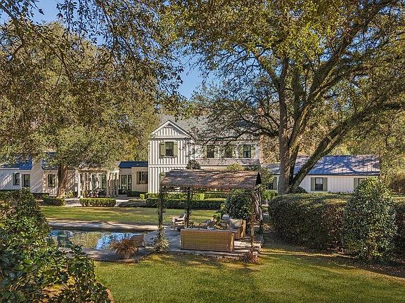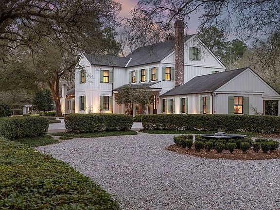 The outdoor spaces are as impressive as the home itself, featuring a resort-style pool, multiple porches, and beautifully curated gardens that invite relaxation and entertaining in every season. River views and lush greenery surround the property, creating a seamless connection between nature and design.