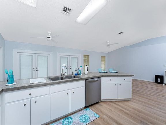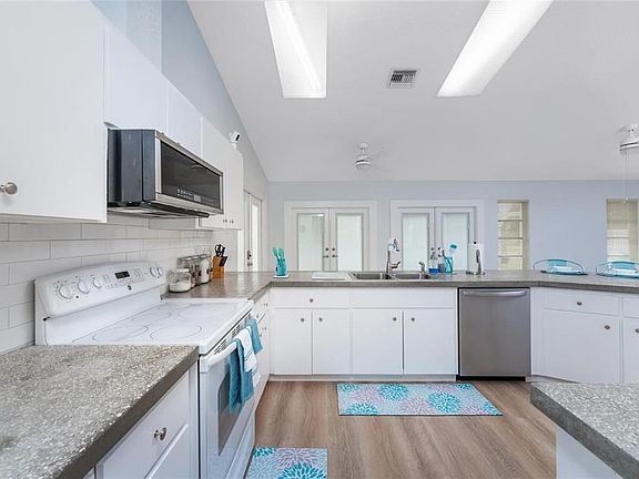 One or more photo(s) has been virtually staged. Welcome to your future oasis! NESTLED ON NEARLY AN ACRE, with access from 3 streets, this IMPRESSIVE 3-BEDROOM, 3-BATH, POOL HOME offers the perfect blend of spacious living, modern convenience, and tranquil outdoor retreats. This home is open with high ceilings and a SPLIT FLOOR PLAN. The kitchen offers a breakfast bar, RECENTLY UPDATED STAINLESS STEEL APPLIANCES, pantry closet. The master suite provides a walk in closet and ensuite bathroom and FRENCH DOORS TO THE LANAI AND POOL. In the main living area you’ll also find easy access to your expansive outdoor area through one of 3 sets of French doors where you can dive into the LUXURIOUS POOL or just relax with your morning coffee or afternoon cocktail — your personal backyard paradise awaits. The screened in lanai and pool area is perfect for hosting gatherings, barbecues, or simply soaking up the Florida sunshine. The home features a two-car garage and two sheds providing ample space for projects and storage. This home is ready for your personal touch, it boasts great bones and SIGNIFICAN RECENT UPGRADES. The ROOF was replaced in 2023 and has a transferrable warranty. the AC system was replaced in 2017. The interior has been recently repainted, new windows in the guest bedrooms, luxury vinyl in the living areas and vinyl plank in the primary bedroom. ADDITIONAL FEATURES include 30 AMP CAMPER/RV PLUG, WIFI controlled IRRIGATION and a CAMERA SYSTEM around the home. Bluetooth speaker, fan, light, combo, in master/primary bathroom. This unique property offers the perfect balance of privacy and convenience with a combined 3 LOTS and 3 ACCESS GATES. Enjoy quick and easy access to shopping, dining, beaches and golf courses. And with no HOA and a triple-sized lot you'll find plenty of privacy along with room for your boat, RV, and other toys. NOT IN A FLOOD ZONE. This is a rare opportunity to own a spacious property.