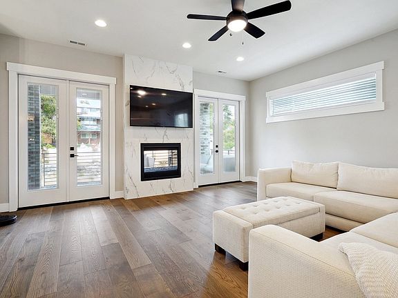 Ascending to the second level reveals a great room where an open-concept layout harmonizes with the impressive kitchen. Vaulted ceilings amplify the sense of space, while a double-sided fireplace adds warmth and a touch of luxury. Another bonus room on this level opens to a large covered deck, perfect for enjoying the fresh Seattle air in any weather.