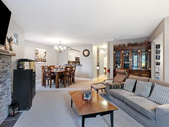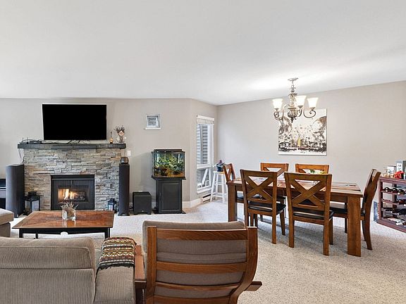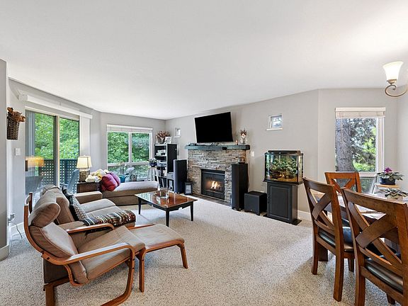 Corner homeQuartz countersTiled backsplashSleek appliancesCozy gas fireplaceLarge windowsLush treeline views