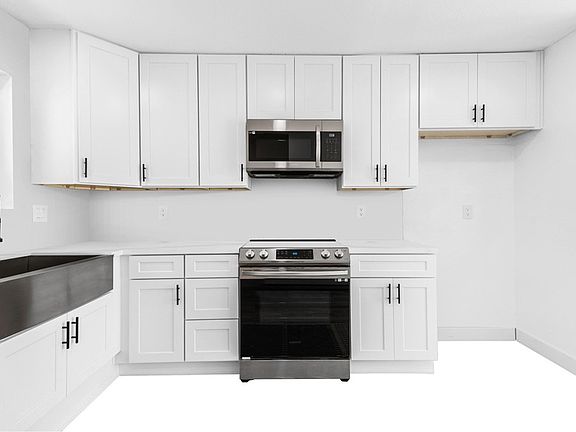 Kitchen with stainless steel appliances: range, stove, microwave, and dishwasher.