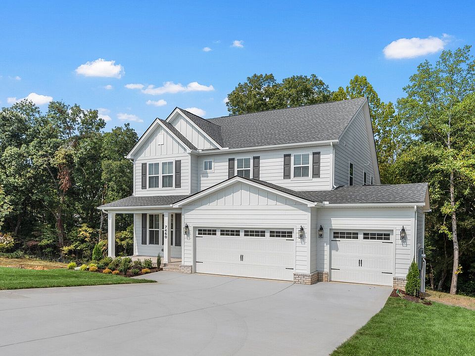 Your Modern Farmhouse Dream on a Spacious Cul-de-Sac: The Lockwood on Lot 8 - MOVE-IN READY! and LOW INTEREST RATE INCENTIVES W/ USE OF PREFERRED LENDER AND TITLE. Step into something special at Goodwin Farms with only 1 of 2 Basement Lockwood floorplans available. This home, perfectly situated on a spacious cul-de-sac, embodies classic charm with its captivating white farmhouse exterior. It features a highly sought-after walk-out basement lot with lovely backyard views of a mature tree line, creating a serene retreat, ideal for unwinding and enjoying the outdoors. This home offers gracious outdoor living with four covered porches, perfect for entertaining or simply finding a quiet moment. Convenience abounds with a front-facing 3-car garage and an extended driveway, ensuring ample parking for family and guests. Inside, the open floor plan creates an inviting atmosphere with three distinct living spaces-providing ample room for gatherings and peaceful escapes alike. The main floor boasts a luxurious primary bedroom and a dedicated study. Downstairs, the walk-out basement offers remarkable flexibility with a bedroom and full bath, dedicated washer/dryer hookups, and even pre-plumbing for a future wet bar, plus additional unconditioned space for storage. The second floor provides generous living areas with three additional bedrooms and two full bathrooms, along with a large den. Photos represent actual home.