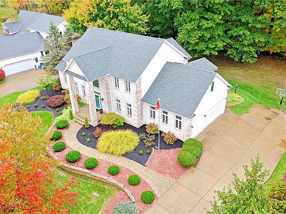 Shrouded in the colorful fall bloom, this towering white brick faced estate is waiting to delight with its massive, 4 bedroom potentially 5 bedroom layout and stunningly unique interior offerings! The amazing Poland home pulls no punches, as its curb appeal continues to deliver; past the elegant landscaping & backyard patio space, to the very moment you step inside past the prominent pillars and into the illustrious 2-story foyer. Take in the soothing, subdued blue and gray color scheme as a center staircase extends upward to the main landing. A stepped ceiling marks the fantastic dining area while bespoke lighting shines on the ash-colored flooring below. Enjoy the home office found opposite with French door privacy. The rear of the home showcases a breathtaking kitchen with masterful tile and marble work, LED underlit countertops and a wrapping, dining area. 1st floor laundry directly off kitchen. The living room wows with cathedral ceilings and a robust brick mantle that rises past the two levels of glass. Upstairs, the master bedroom exudes opulence with its rich carpeting, sculpted ceilings and a glass block reveal shower that leads into a private bathhouse fit for royalty. A trio of additional bedrooms join a full common bath with skylight, along with a second bath found in the guest bedroom. The partially finished basement offers a finished rec area, 2nd laundry area, storage, a fifth bedroom, and an additional full bath. Call today to make this your new home!!