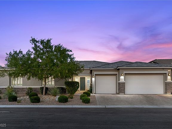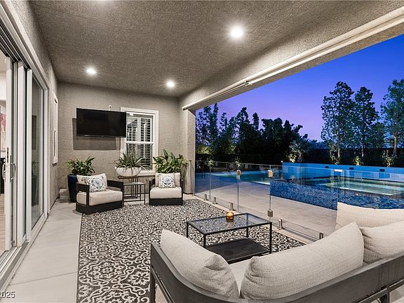 Step inside a masterpiece of modern luxury! Located by the highly desirable Skye Canyon community, this single-story estate is designed to impress. Spanning 3,450 sq ft on a massive, nearly quarter acre lot, this home is more than a residence—it's a destination. Prepare to be captivated by the grandeur of the living space, where soaring 15-foot ceilings create an atmosphere of pure elegance with custom-designed ceiling beams. The modern light fixtures and temperature-controlled wine cellar highlight the meticulous upgrades throughout. With four bedrooms, four bathrooms, and office, this home offers incredible flexibility—one of the bedrooms features a private ensuite bath, making it the perfect multi-gen suite or guest retreat. But the real showstopper is the backyard. This resort-style paradise features an oversized pool and spa, stunning sunken living room with TV, surrounded by lush, mature landscaping for ultimate privacy. Just minutes away from shopping, dining, and entertainment.