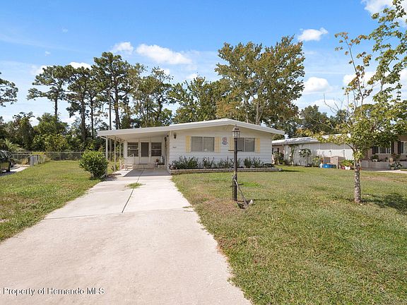 This 2 bedroom, 2 bath home with a covered carport wraps you in a sense of comfort the moment you walk through the door, like a favorite sweater on a cool morning. With a brand new roof installed in January 2025, it offers the kind of security that lets you settle in and breathe easy. Inside, the kitchen's warm wood cabinetry and brick backsplash feel like the heart of the home, perfect for slow breakfasts and shared stories. Sunlight pours into the living and dining areas, casting a gentle glow on vintage touches and cozy corners. The sunroom, lined with windows, is a quiet haven for morning coffee or afternoon daydreams, while the bedrooms offer soft light, generous storage, and a feeling of calm. Step outside to a peaceful yard with a private shed, ideal for gardening tools, holiday decorations, or a weekend project space. This home is nestled within High Point Community, a gated 55+ neighborhood known for its vibrant lifestyle and welcoming atmosphere, where residents enjoy access to an 18-hole golf course, driving range, solar heated swimming pool, and a variety of sports courts including tennis, pickleball, shuffleboard, bocce ball, and horseshoe pits. Just 3.2 miles away, Weeki Wachee Springs State Park offers magical mermaid shows and serene kayaking, while Pine Island Beach, only 7.8 miles from home, invites you to unwind with sunsets and sea breezes. Cortez Commons, just 2.5 miles away, makes errands easy with shopping and dining close by, and with the Suncoast Expressway only 5.6 miles from your doorstep, commuting to Tampa or exploring the Gulf Coast is smooth and simple. This isn't just a house—it's the kind of place that feels like it's been waiting for you.