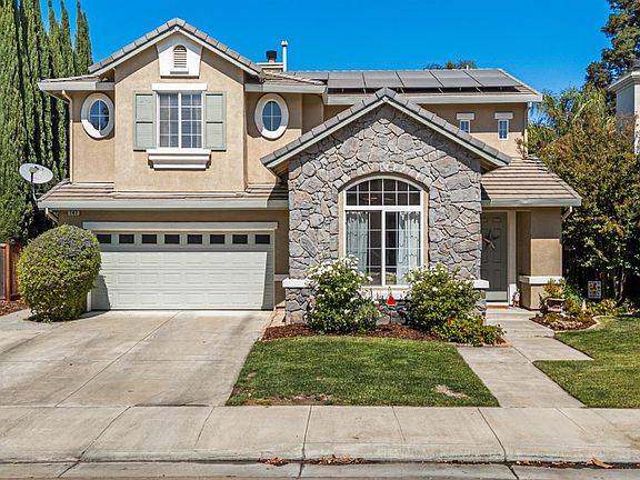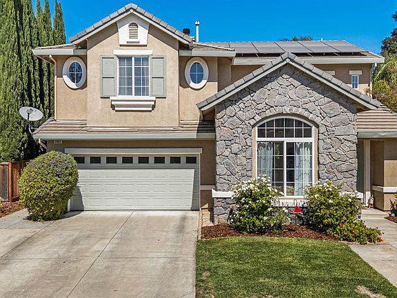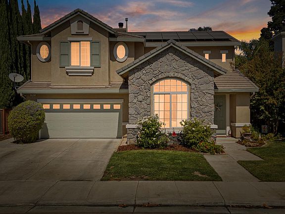 Gorgeous home with pool & solar!! Tropical backyard features lots of palm trees (Queens, Robillinis, Segos, Banana palms), a large inground Tahoe Blue pool, raised spa with spillway, bull-nose brick perimeter, newer heater, variable speed pump, lawn ornaments, 2 cement benches, newer side fences, concrete patio, leaf-guard gutters on back of house, 17-panel Sunrun solar system, $190/mo lease, newer LVP flooring downstairs, newer HVAC, 1 bedroom downstairs, brick accent wall at dining room, remodeled kitchen has slab granite counters, brick backsplash, gas cooktop, new d/w, stainless oven & m/w, newer stainless fridge, island with sink & breakfast bar, white-painted cabinetry & cab pulls, family room has built-in entertainment center & tile-face fireplace, down bath has stall shower, LVP floor & newer sink faucet, primary BR includes 2 sinks, tub, stall shower, 2 walk-in closets & tile floor, BR 3 has French doors & closet for office, mirrored closet doors in BR 4 & 5, hallway tech center with desk, upstairs laundry room has electric dryer hookup & cabinetry, finished garage with opener & wood shelving and front has stone accent wall. Come see this resort!!