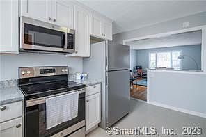 This incredible 2 bedroom, 1 bathroom, 825 square foot rental condo has sparkling hardwood floors throughout, including both bedrooms. Granite countertops and new stainless steel appliances in the spacious kitchen, washer and dryer in unit, and detached garage parking! In the heart of West Hartford's famous Bishop's Corner shopping area - restaurants, grocery shopping, banking, and more are just across the street. This condominium building is centrally located, near 84 East and West highways, 91 North and South highways, and in close proximity to Blue Back Square and West Hartford Center. Pets are welcome. One additional parking space in the lot. Secure storage is available in the lower level. Credit check is required. One year minimum lease. Available 11/1/25. Cabinets in this unit are Maple in color, not white as in photos. Pictures are of a similar unit in same complex.