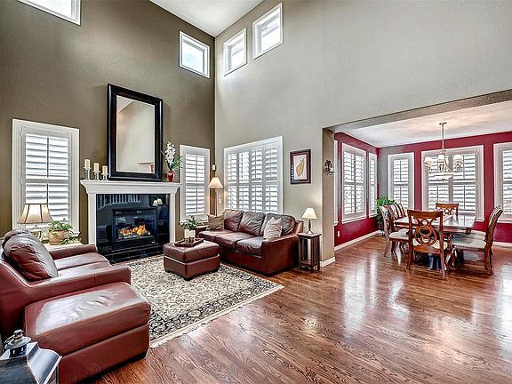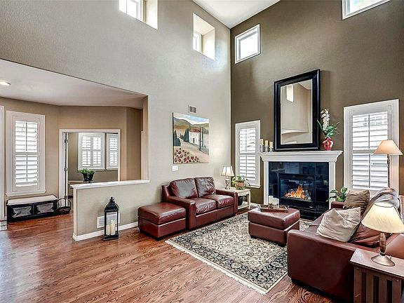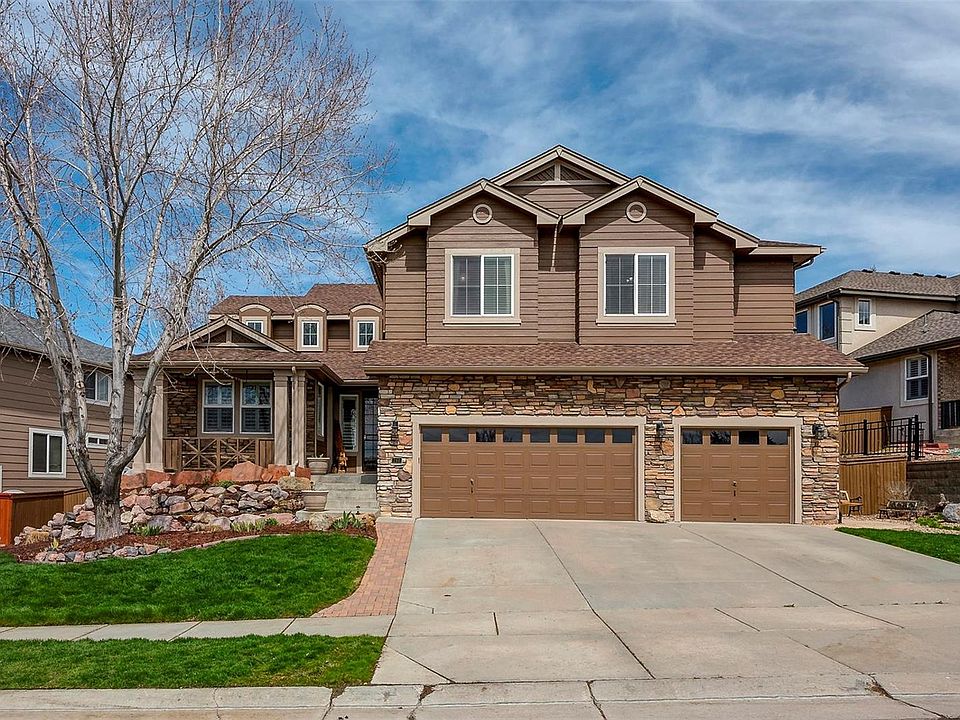 Nestled in the Stonebury neighborhood of Highlands Ranch, this exquisite Timber Ridge model by Shea homes features many luxurious upgrades throughout. Durable and elegant main floor hardwoods, cased window trim with plantation shutters, granite kitchen surfaces on cherry cabinetry with stainless steel appliances featuring chef inspired 5 burner gas cooktop and double oven with convection. The formal living room with adjoining dining room provide an elegant space for entertaining, while the oversized family room adjacent to the kitchen and nook offers casual relaxation - the perfect setting for that peaceful night at home. Upstairs you will find the master bedroom/retreat which can be converted to a 5th bedroom - see floor plan illustrations in photos. There are 3 additional spacious bedrooms including a full hallway bath and full en-suite guest bath. Outside you'll find a beautifully manicured lawn with in-ground sprinklers and extensive flagstone patio with gas fire pit out back.