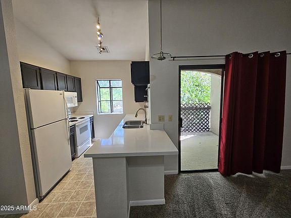 Beautiful 2 bed, 2 bath condo with vaulted ceilings for a spacious feel. New quartz countertops, sinks and faucets, and a new tub and tile surrounds in master bath. In unit washer dryer, dishwasher, microwave range hood and refrigerator included. Stunning 2 full bathrooms with quartz countertops. Community pool is a nice feature and 1 covered parking spot. Located close to freeway, shopping and roughly 10 minutes to sky harbor airport.