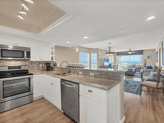 Come see this beautifully appointed and well maintained Gulf front, 2 bedroom, 2 full bathroom condo in the sought after association of Palm Island Village II, located on a private island in Palm Island Resort. The 180 degree spectacular view of the Gulf and its aqua blue water and miles of beach, are just steps away. Take a 4 minute car ferry ride over and discover our definition of serenity. As you enter the parking lot, where your gas powered vehicle will stay, a bellman may deliver you and your belongings to your own piece of paradise via a golf cart, which is the preferred mode of transportation. The condo is located on the 1st floor of the stilted building. As you enter the unit, your spacious laundry room with stainless washer and dryer, granite counters and plenty of cabinet space, is to your right. Straight ahead is the nice sized kitchen with soft close cabinetry, granite counters and stainless appliances comes well equipped in this turnkey home. To the right of the kitchen is the guest area that can be cordoned off as its own private suite with a full bath and a bedroom with a king size bed. Stepping back into the living area, the breakfast bar with stools are also part of the dining area. The dining area with its bowed window, adds to the spectacular view. The open floor plan continues out onto the screened in lanai with sliders. The outdoor stairs from this deck are still in the midst of being rebuilt by the association from the hurricane. The primary suite that is off of the living area is a beautiful, peaceful oasis furnished with Tommy Bahama. The nicely renovated bathroom has a walk-in shower and dual sinks. Imagine waking up to those views! The sunsets are memorizing every night. It has wooden laminate and porcelain tile throughout. No carpeting. There are community pools, tennis courts and pickleball courts. Community docks. The only retail on the island is in the resort with its Rum Bay restaurant, Coconuts for sundries, ice cream and golf cart rentals. And a gift boutique. There are miles of beautiful beach. The intracoastal. Lots of nature to learn and explore. On the mainland you have many outstanding golf courses, restaurants, shopping, fishing, boating, and many community events. All assessments and fees are paid up to date. Come enjoy your own piece of Paradise!!