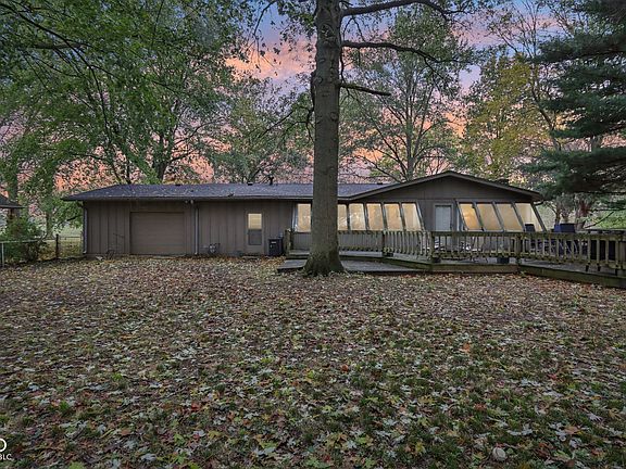 Set on a serene 1.12-acre lot spanning two parcels, this stunning custom mid-century modern all-limestone ranch blends timeless architecture with peaceful country living. Overlooking a tranquil pond next door and surrounded by mature landscape, the property offers both privacy and convenience-just minutes from Pendleton schools and area amenities. Inside, you'll find three spacious bedrooms and two full baths, thoughtfully designed to capture natural light through multiple skylights. The galley-style kitchen sits at the heart of the home, connecting seamlessly to the surrounding living spaces. The inviting family room features a cozy wood-burning fireplace, creating a warm and welcoming focal point for gatherings. A rare indoor atrium spans the entire width of the back of the home-an absolute dream for plant enthusiasts or anyone who loves bringing the outdoors in. Step outside to a large deck overlooking the fenced backyard, ideal for entertaining or enjoying quiet evenings by the water. The three-car garage includes a convenient pull-through overhead door, making backyard access and projects effortless. If you're seeking mid-century charm, natural beauty, and everyday functionality, this exceptional limestone ranch delivers it all.