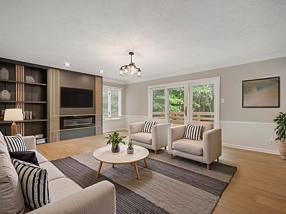 Finished basementSleek electric fireplaceElegant dining roomMain-level deckFlex roomPrimary suiteSpa-like ensuite