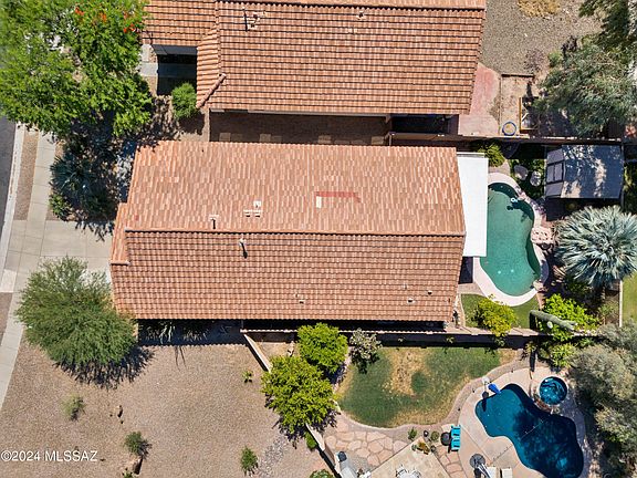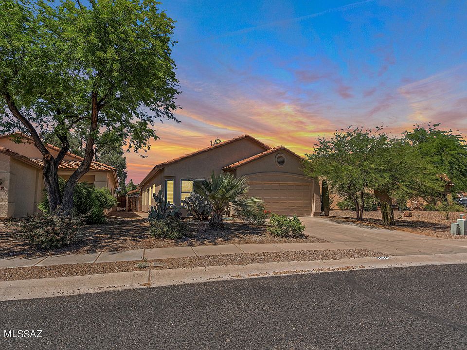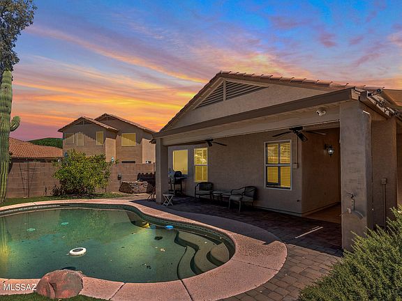 Move into this most desirable Continental Ranch neighborhood. Your charming home features your very own tropical backyard paradise with a pebble tec pool, accented with mature vegetation, a saguaro, pavers, and turf. Imagine lounging by the pool, sipping on a drink, and soaking in the Arizona sunshine. Enjoy a fully covered patio with 2 ceiling fans and a motorized awning. Vacation in your own backyard! Soaring vaulted ceilings and natural light make for a dreamy interior complete with white plantation shutters & central vac. The kitchen features granite counters, a breakfast nook, and a built-in coffee bar. The split bedroom plan lends to a private and spacious primary suite completed by  large walk-in closet with shelving and a gorgeous ensuite. All bedrooms have warm wood flooring. Premium end lot with no home blocking one side. Located in the highly sought-after Continental Ranch community, you'll enjoy access to a variety of amenities, including parks, a splash pad, a playground, pools, including a kiddie pool, a hot tub, sports fields, and a community/rec center. Plus, with easy access to the Loop, major highways, shopping centers, and top-rated schools, this home offers the perfect combination of convenience and comfort. Don't miss out on this opportunity. Schedule a showing today and experience the best of Tucson desert living in Continental Ranch!