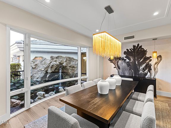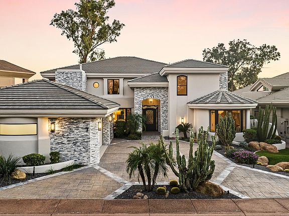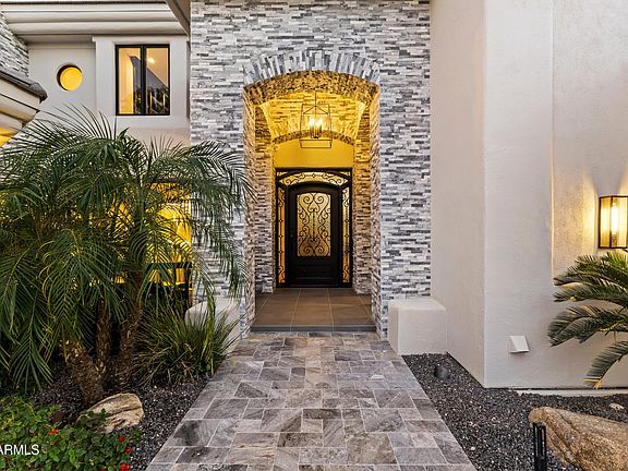 Inside GAINEY RANCH sits a fully transformed 7,653sq ft estate with UNOBSTRUCTED, front-row panoramas of Camelback Mountain and the 7th & 8th holes of the Lakes Golf Course. Clean lines guide you through warm light, calm flow, and refined finishes. The kitchen brings rift-cut oak cabinets, Taj Mahal stone, Thermador appliances, and contemporary design. The main-level suite provides a stone tub, rain shower, dual vanities, and a fireside nook. Four en-suite rooms support guests with ease. The lower level adds a gym with commercial grade flooring, mirrored walls and a tiered theater with Italian leather seating. 24/7 guarded privacy, Estate Club amenities (tennis, fitness, pool, events), and optional Gainey Ranch Golf Club membership—all minutes from Scottsdale's finest dining & shopping.