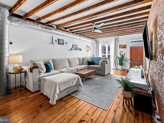 2012 New Renaissance/John Bolster renovation with modernized updates. Expansive main level with original hardwood floor, exposed brick, and custom joist/drywall work in the living room. Kitchen opens up to living room with custom wood breakfast bar. Powder room off of kitchen. Large dining room in the rear, leading out to concrete patio overtop of the attached 1 car garage. 2 beds and 2 full baths upstairs. Exquisite primary suite with vaulted ceilings and custom joist/drywall work. Two closets and double-vanity in ensuite bath. Both upstairs bathrooms tastefully updated with marble tile and upgraded finishes. Balcony off of rear bedroom. Laundry in upstairs hall. Interior access stairwell to wet bar and rooftop deck. Fantastic views from rooftop deck of the water and Domino Sugar sign. Fully finished basement as 3rd bedroom and large utility closet for storage. New main roof (2023), water heater (2024), dishwasher (2024), washer/dryer (2023), garage door (2021). Listing agent is owner.