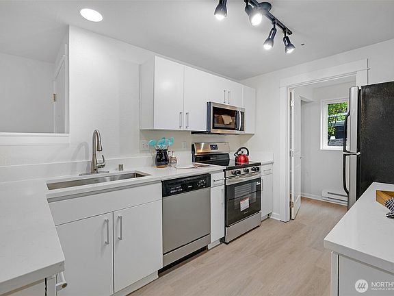 Move-in-ready condo in Mira, the heart of Kirkland’s downtown neighborhood. This ground-floor unit feels spacious with new LVP flooring, new carpet and fresh paint throughout. Open concept layout features updated kitchen with white cabinets, quartz countertops, SS appliances and breakfast bar, flowing into living/dining area with cozy wood-burning fireplace. Sliding doors lead to patio with privacy screen. Split bedrooms ensure privacy: primary suite offers double closet and updated bath; guest room served by adjacent full bath. Full laundry room, storage, two parking spaces (one covered). Pet-friendly with no rental cap, plus amenities including pool and hot tub. Minutes to Google, Kirkland Urban, parks, I-405 & Lake Washington schools.
