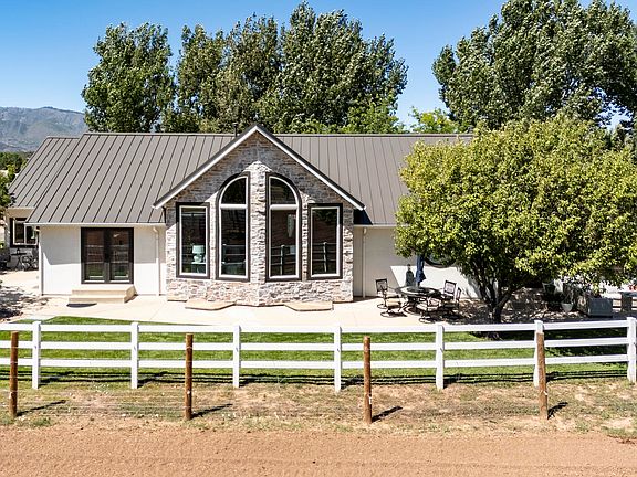 Stunning 3-Acre ranch with breathtaking views. Welcome to your dream retreat in the heart of New Harmony! This one-of-a-kind, 3-acre ranch offers unparalleled views of the Kolob 5 Fingers, making every sunrise & sunset a picturesque experience. Recently renovated with a new metal roof & stucco, this property is move-in ready and filled with modern upgrades. Inside, enjoy the warmth of beautiful, engineered hardwood flooring and the fresh look of new paint throughout. The kitchen features state-of-the-art GE Café appliances. The outdoor space is an entertainer's delight, complete with a private pickleball court, a luxurious Olympic training swim spa & a covered pavilion for year-round enjoyment. The property also includes a charming, attached casita with its own entrance. kitchenette, & bathroom ideal for guests, mother-in-law, or as a potential rental unit. Surrounded by mature trees & lush landscaping, the grounds are beautifully illuminated with outdoor pathway lighting. Cozy up by the firepit under the starry skies, or pick fresh cherries, nectarines, and apples from your own orchard.