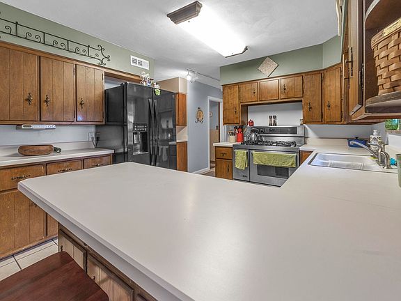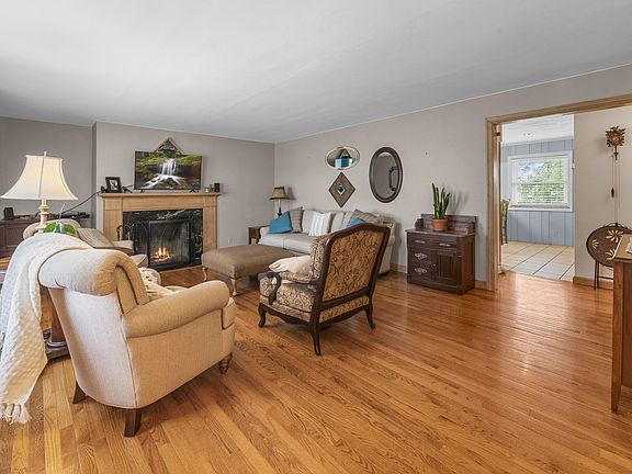 Step into timeless elegance with this spacious 3-4 bedroom, 2.5-bath sprawling mid-century brick ranch. Nestled on 3 generous lots, this home offers room to grow, entertain, and relax in style. The full partially finished basement is perfect for added living space and storage. Unwind in the large master retreat with a private en-suite bath. Step into a beautifully preserved vintage bathroom that exudes character and warmth with a spa-like ambiance, a spacious vanity that features a tiled countertop, rich wooden drawers, and a large mirror framed by classic Hollywood-style lighting—perfect for morning routines. Warmth and charm emanate from the gleaming Bruce Hardwood Oak floors that flow through the main living area, anchored by a cozy fireplace perfect for those crisp winter days. The enclosed breezeway is a versatile space to enjoy and opens to the cottage style private rear patio that is perfect for outdoor dining and quiet evenings. The cedar-lined closets offer a touch of luxury you would expect in a mid-century home. The attached oversized 1 car garage offers a smart garage door opener for convenience and security. Enjoy cozy warm budget friendly utililty bills thanks to the updated gas boiler with ceiling radiant heat and updated windows.. The roof is only 8 years old for peace of mind for years to come. Experience the enduring charm this home has to offer!