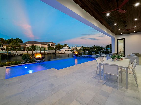Unwind in your private backyard oasis, featuring a sparkling pool, spa and sun shelf, gas decorative fire features, sandblasted marble decking and covered lanai with summer kitchen for outdoor entertaining. The 70-foot composite dock provides easy access to the water for boating or fishing. Enjoy breathtaking sunsets, serene water views, and cozy evenings. The outdoor kitchen is perfect for grilling and entertaining guests. Additional features include a 4-car garage, .2683 acres of land, 90 feet of water frontage, and beautifully landscaped grounds.