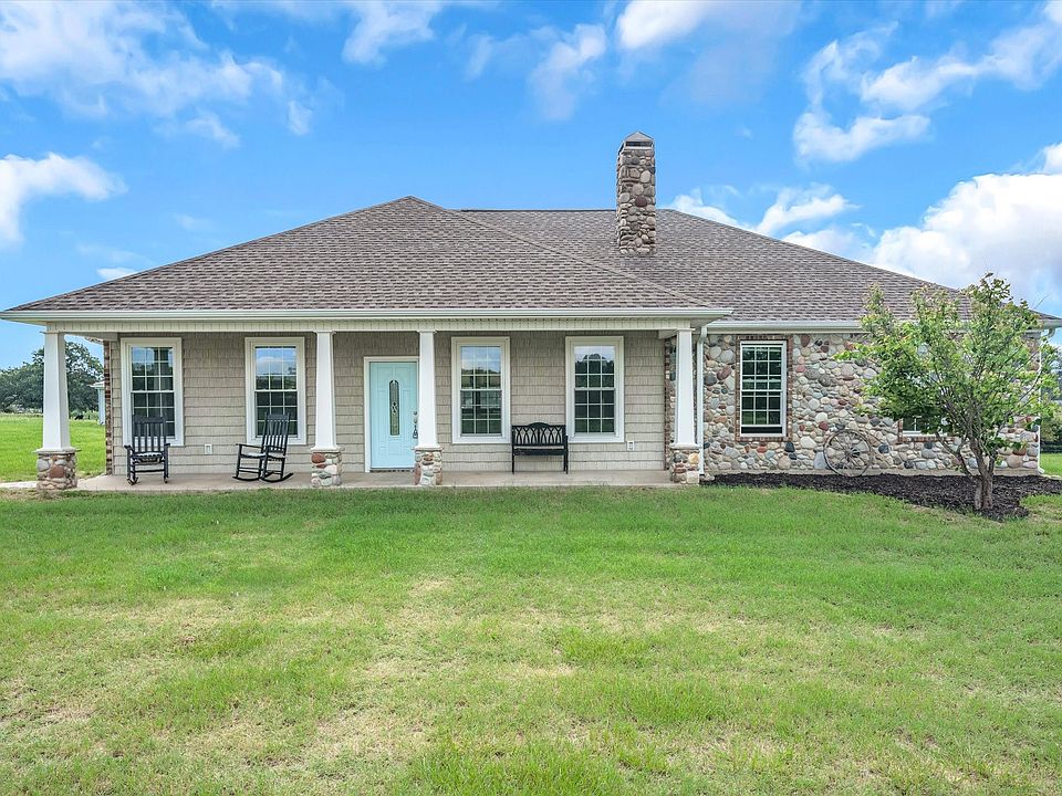 As you approach the property, you'll be captivated by the private entrance and serene landscape. The inviting exterior features a large front, and back porch, a 2 car garage, and a separate storage building that already provides water and electricity.