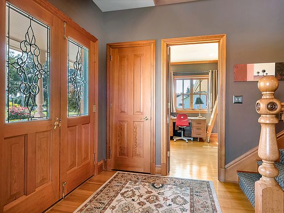 Solid brick, extensive custom woodwork throughout, classic European style. Three wood burning fireplaces, views of valley and Canadian mountains. Sweet, pure well water. New roof, kitchen quartz counters, new furnace.