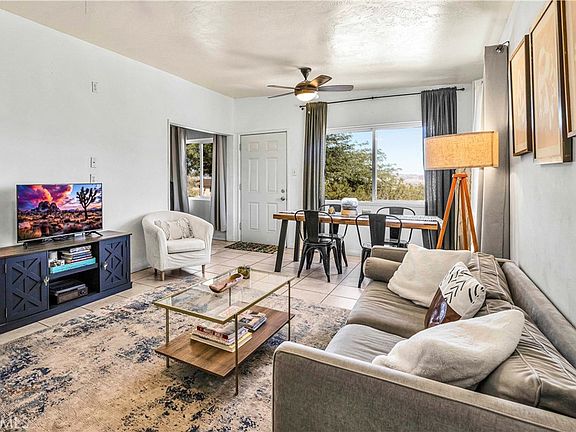 Location Perfect! Only 3.5 miles to the entrance gate of the Joshua Tree National Park, and mere minutes to Downtown 29 Palms, you will enjoy both nature and convenience at your doorstep. As a long-time, successful vacation rental, this home has consistently generated income while providing guests with a memorable desert getaway. Whether you are looking for a personal desert retreat, a proven vacation rental investment, or both, this property offers the perfect blend of comfort, style, and unbeatable location. The yard is a peaceful haven, featuring mature desert landscaping and panoramic views of the surrounding desert and mountains—offering breathtaking sunrises and sunsets. The expansive, private backyard is an entertainer's dream, featuring the iconic cowboy pool, multiple seating areas, a new storage shed, and a large desert willow tree whose shade will be everyone’s favorite gathering spot. Inside, the home has been tastefully improved to provide a bright, airy, and welcoming atmosphere. The open Livingroom and dining area boast a ton of natural light, with tile flooring, upgraded, energy-efficient windows, and ceiling fans throughout. The kitchen has been updated but still retains its rustic charm. Newer cabinets are complimented by quartz countertops, a large chef’s sink, and stainless-steel appliances. Both bedrooms offer a cozy retreat with wood-beamed ceilings, large windows, and ceiling fans to keep things comfortable year-round. The Bathroom has been stylishly completed in a dark, contrasting, matte finish porcelain tile and a compact vanity to maximize space. The convenient indoor laundry area is a bonus and outfitted with a new washer and dryer set. The crowning jewel and best protection for your investment is the new roof that was installed this past Spring! Whether you’re hitting the trails of Joshua Tree National Park for world-class hiking, rock climbing, or stargazing, or enjoying the delicious local cuisine just minutes away, this property’s location is unbeatable. The park's stunning desert landscapes, wildlife, and iconic rock formations are right at your doorstep, making this home a prime spot for nature lovers and outdoor enthusiasts. Do not miss your chance to own a slice of desert paradise! This lovely Home can be sold turn-key furnished! Inquire about details. Schedule your viewing today!