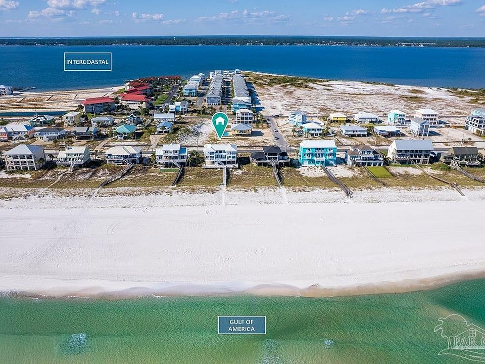 Ultimate Luxury Coastal Living – Renovated inside & out! Waterfront Beach House at Navarre Beach. Experience the pinnacle of beachside elegance in this fully furnished 4-bedroom, 3.5-bath waterfront home, ideally located on Navarre Beach on the Gulf of America. Designed for relaxation and unforgettable entertaining, this spectacular property features high-end finishes, exceptional décor, and the convenience of a private elevator. Step inside to a breathtaking great room with soaring two-story ceiling, a wall of windows showcasing Gulf views, an electric fireplace, and a mounted TV—creating a welcoming atmosphere. Luxury vinyl plank flooring, recessed lighting, custom tile work, and framed windows and doors throughout add a touch of sophistication and modern style. The open-concept floor plan flows seamlessly from the spacious family room and dining area to the expansive covered deck—perfect for enjoying the coastal breeze and panoramic water views. The dining area offers uninterrupted views of the Gulf. The fully equipped kitchen is a chef’s dream, featuring an oversized island with prep sink, quartz countertops, tall soft-close cabinets, a 5-burner cooktop, stainless steel appliances, wall ovens, a beverage fridge, and a built-in ice maker. Adjacent to the kitchen, you’ll find a well-appointed laundry room and a convenient powder room. On the east end of the second level, the waterfront primary suite with a spacious custom closet and a luxurious bath, complete with a tiled walk-in shower, dual solid surface vanities, and makeup area. The third level features a second living area with direct water views, a waterfront bedroom with access to a private covered deck, plantation shutters, and a beautifully tiled tub/shower combo with custom vanity. Two additional guest bedrooms share a well-designed bath with a double vanity and tiled tub—one with deck access. Exceptional premier primary residence, upscale vacation home, or a high-performing vacation rental.