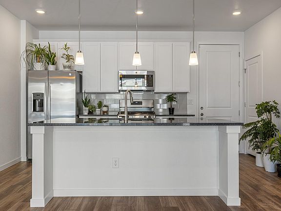 Beautiful 2 bedroom, 2.5 bathroom spacious townhome. The large covered front porch welcomes you to the front of the house and through the front door. The main floor has a modern and open concept living room, and the kitchen boasts modern upgrades such as quartz counter tops, stainless steal GE appliances, gas range, large eat-in island, plenty of cabinet storage, and a walk-in pantry/closet.