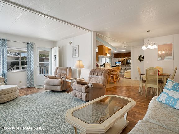 ACTIVE WITH CONTRACT - BACK-UP OFFERS BRING ACCEPTED.... LET THE SUNSHINE IN! Don't miss this beautiful FULLY FURNISHED and UPDATED the EVEN INCLUDES THE GOLF CART. Located in the popular 55+ community where you own your own land. This 1318 square foot home features a large ISLAND KITCHEN with TILE FLOOR, STAINLESS APPLIANCES, and OAK CABINETS next to a DEN WITH WET BAR. The home also offers a large updated master bath, 4-season tiled Florida Room ,Extended workshop/utility room and separate GOLF CART GARAGE. Vinyl siding. Solid skirting. A/C 2006. Roof 2008 Low HOA fee of $40/month. New skylights (2020). Community amenities include tennis, heated pool, horseshoes, bocce, community center, pickle ball and more. Located near major medical facilities, shopping and restaurants.