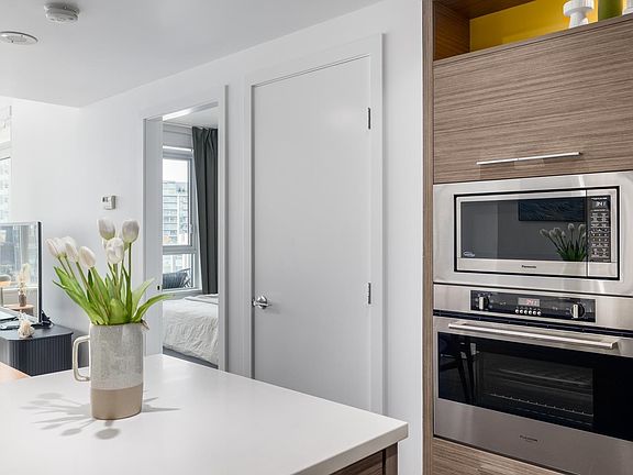 Radiant flooringQuartz countertopsIntegrated side-by-side refrigeratorOpen concept living spacePrivate balconyNewly installed blackout curtainsGarden courtyard