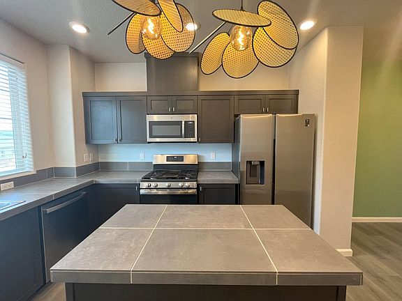 The kitchen boasts a contemporary design with gray tile countertops, sleek dark wooden cabinetry, and stainless steel appliances, including a gas stove for precise cooking. A double-basin sink sits beneath a wide window, offering pleasant views and natural light while you cook or clean. The dining room sits conveniently between the kitchen and living room, making mealtime gatherings effortless.