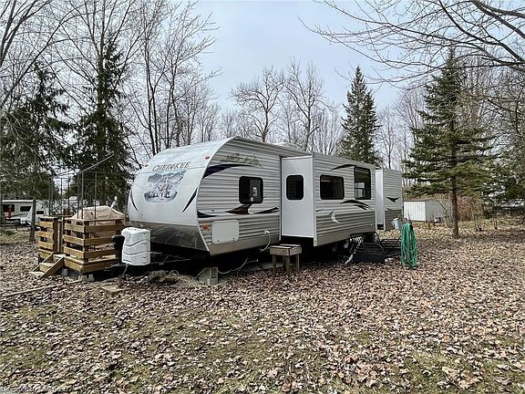Check out this great pie shaped lot!! This 2012 Cherokee mobile home is your great Cottage Alternative! The unit is located in Parkbridge Spring Valley Resort a 3 season resort that opens the weekend before Mother's day and closes the weekend after Thanksgiving. The park offers 2 pools (1 adult and 1 family, a beach area, mini putt, rec. programs for the kids and events for the adults as well! Located across the street from the park/baseball diamond, this lot is great for kids. The lot is a very large and private pie shape that back onto a forest and has a creek running along the side. The unit has a large tip out in the kitchen with wrap around dining table and a futon style couch for extra sleeping. The master bedroom offers a queen sized bed with lots of storage and the second bedroom has a tip out with 3 bunk and an entertainment area. This great unit also includes a fully flushing toilet and a door to the outside from the washroom. Call to book your showing today!