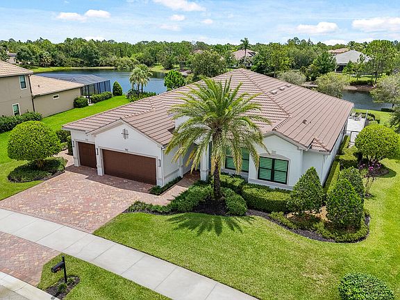 Elegance and thoughtful design come together in this exceptional residence located in the prestigious gated community of Copperleaf. Positioned on a beautifully landscaped 0.4-acre lakefront lot, this 4-bedroom, 3-bath Clubview model offers 3,089 square feet of sophisticated living space and a rare 3-car air-conditioned garage. The home's interiors are defined by timeless finishes and curated details: coffered ceilings, crown molding, wood accent walls, stone features, and plantation shutters. The expansive great room flows seamlessly into a gourmet kitchen outfitted with KitchenAid and LG appliances, custom cabinetry, a glass tile backsplash, and an oversized island ideal for gathering. Designed for elevated everyday living, the split-bedroom floor plan ensures privacy when needed, but also creates and absolutely perfect setup for indoor-outdoor entertaining. The primary suite features custom closets with built-in dressers and a fully equipped bath that will feel like a retreat. Outdoor living is elevated by a resort-style pool with sun shelf, three water features, cabana bath, and a covered patio with motorized and hurricane screensperfectly positioned to capture the southeast light and expansive lake vistas. Impact glass windows, new front and rear landscaping, and low-voltage lighting add beauty, security, and peace of mind. Located in a gated neighborhood with premier amenities and zoned for top-rated schools, this is a residence where luxury and livability meet in perfect balance.