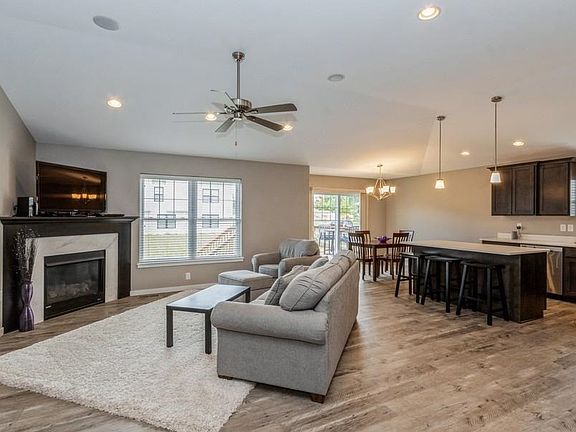 Bright, lightly lived in, well maintained ranch home looks like new...but includes window treatments, and washer & dryer! Open floor plan welcomes you to living area with corner gas fireplace, LVP flooring throughout, kitchen with granite, island, breakfast bar, stainless steel appliances, plus dining area with slider leading to deck w/ stairs down to yard. Primary suite is a dream with trey ceiling, double vanities, oversized shower, large closet area. Surprise bonus... door leading to laundry room! Large lower level with family room, 2 large bedrooms and full bath.