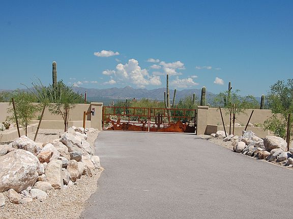 You'll love the VIEWS of neighboring SOMBRERO PEAK, the CATALINAS to the east as well as the QUIET SOLITUDE, tall SAGUAROS and LUSH VEGETATION of this 3.51 acre BEAUTY. Intimate, GATED, 11 home community of HIGH END CUSTOMS with PAVED streets and underground utilities incl. water, gas , electric, cable and phone. This FLAT, EZ build site has a WONDERFUL RURAL feel, yet is only minutes to I-10, shopping and services. One of the prettiest areas in the TUCSON MOUNTAINS. Easy to walk and show. See the 'Documents' section for drawings of an appx. 3600 sq. ft. custom home designed for this lot by Talavera Homes. Drive out and your clients will FALL in LOVE with this one.