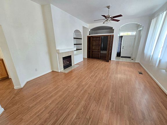 Located in a cul-de-sac near Red Hawk Golf Course, this 4-bedroom, 2-bath home offers 1,646 square feet of well-designed living space. The open layout includes vaulted ceilings, laminate flooring, and a bright living area centered around a gas fireplace with built-in shelving.