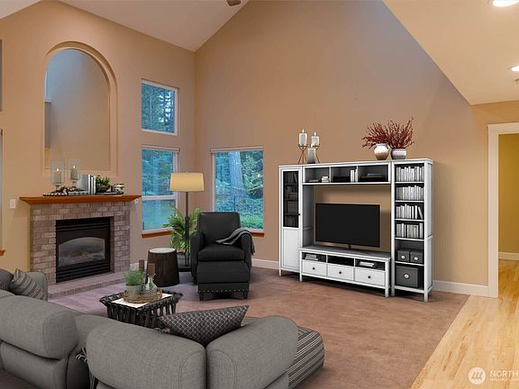 Beautifully updated 4-bedroom + office home in desirable Central Kitsap School District. Nestled on a flat, fully landscaped half-acre lot, this two-story gem backs to peaceful woods and a protected green space. The fully fenced backyard is an outdoor retreat-featuring a composite deck, hot tub, RV parking, and a versatile playhouse. Inside, enjoy soaring ceilings in the light-drenched family room, a stunning new kitchen w/butler pantry in passage to dining room, and an updated upstairs hall bath. Freshly finished hardwood floors add warmth and style both upstairs and down. With excellent curb appeal, this home offers space, comfort, and modern updates—ready for you to move right in! Digital virtual staging to show perspective.