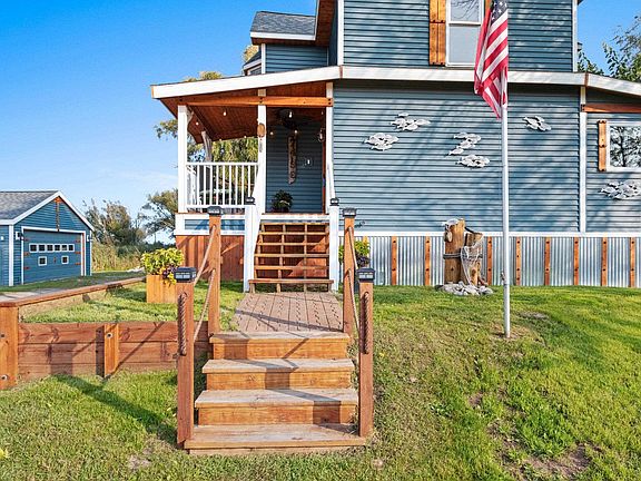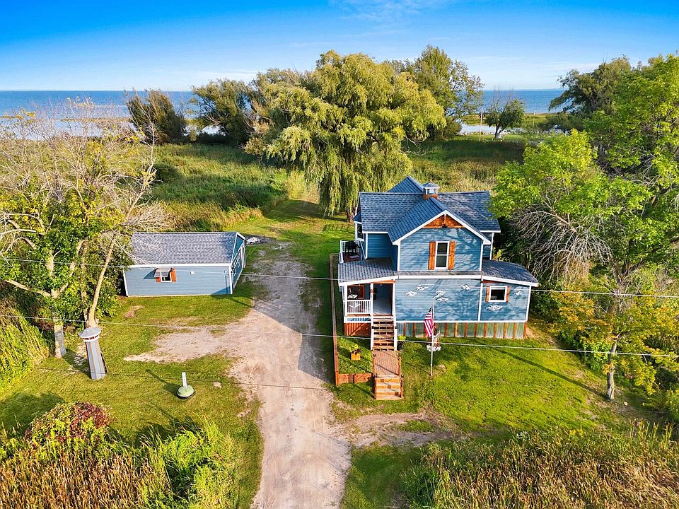 WATERFRONT ON THE BAY! A Gem in the rough. Completely remodeled 2 story with 2/3 bedrooms, office, 2 full baths and stunning craftmanship. Complete beach vibe with outstanding built ins and décor, from wood ceilings, beams, hardwood floors, barn doors, wrap around double decks, outside entertaining area, fully appliance kitchen, Patio doors on lower level, French doors on upper level to view outstanding views. 2 detached heated garage. Decorative light house, yard ornaments. LPFA, C/A, roof new in 2020. The entire set up is a Wow factor! Both full bathrooms/laundry area to be completed for showings/Seller putting on final touches. No pictures of upstairs bathroom (to come)/has walk-in CT shower and jacuzzi tub.
