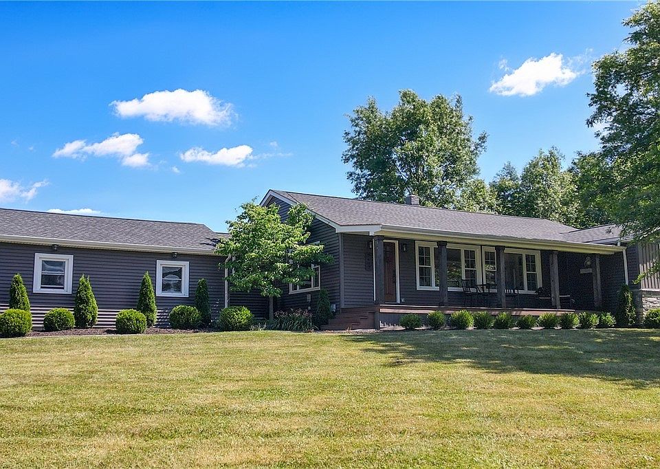 Welcome home to your very own private Oasis! This home truly has it all. The property provides just under 8 acres of land and features 3 beds and 3.5 baths with the possibility of a 4th bedroom. Enjoy the refinished original Hardrock Maple Floors, Updated Glazed Maple Kitchen Cabinets, a complete living room remodel with vaulted ceilings and a fireplace, a Primary bedroom addition and updated en-suite bath with a walk-in closet, an updated guest bath with a Jacuzzi tub, a finished basement with a mini kitchenette, bar and bedroom with an egress window, new double pane windows throughout, new egress windows in the basement, new furnace, new siding, new wood doors, updated trim and too many more updates to list! And just when you thought it couldn't get any better, step outside to your outdoor Oasis featuring beautiful landscaping, a paver patio surrounding an In-Ground Pool, Outdoor Kitchen, a covered sitting area, a dining space, a covered porch, and easy access to the attached garage. You'll also enjoy the ample storage space with the large garage/barn, canvas outbuilding, and an additional storage shed. The large covered front porch also provides a view of the private pond out front. This home checks all the boxes and is ready for its new owner to enjoy everything it has to offer.