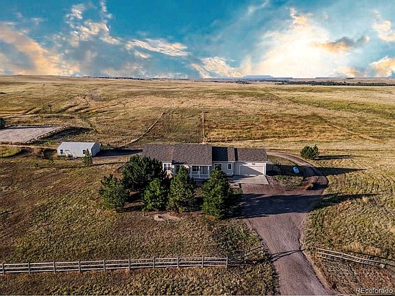 All offers and updates are managed through FinalOffer.com. Agents and Buyers are encouraged to follow the property there for real-time alerts on offers, reverse offers, offer ranking, buy-it-now opportunities, offer reserves and price reductions. Ranch style home on 35 sprawling acres. Move-in ready with brand new carpeting & beautiful hardwood flooring. Kitchen w/ quartz countertops & Farmhouse style. Primary suite w 4 piece bath, 2 closets & windows to the barn to keep an eye on your horses. Family room opens to majestic views to enjoy from the deck. Unfinished walk-out basement offers room to grow. water softener & 2 pressure tanks. Domestic well permit allow for extensive watering. 3 stall barn with rubber mats. Three fenced pastures. Add'l amenities include a corral, arena, round pen, & bridle paths attached to each home in neighborhood. Enjoy nearby golfing, shopping, & amenities with short drive to DIA and DTC. New roof, furnace, central AC, pressure tanks & water heater. High-speed Maverix fiber optic WiFi.. Conveniently located with paved roads and school bus stop at end of driveway. The Foxwood Ranches is low taxes only 71 mills. This estate offers unparalleled comfort & convenience for & you & your animals. See agent's website for more info and make sure to check out the drone video https://media1.cineflyfilms.com/sites/7498-patrick-trail-elizabeth-co-80107-18308066/branded