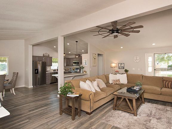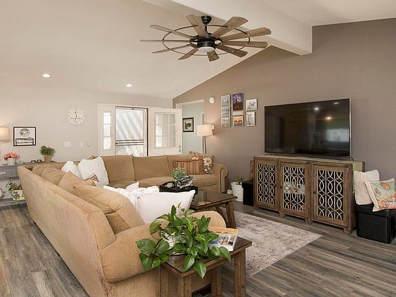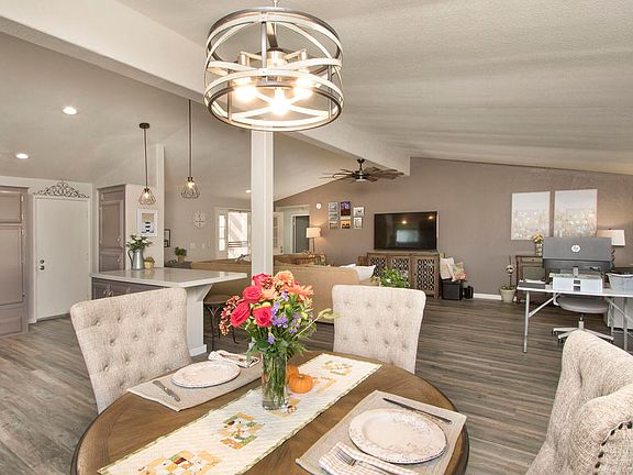 Beautifully remodeled home has been meticulously maintained and fully upgraded including new kitchen appliances. Modern open concept with vaulted ceilings complimented by new vinyl plank flooring and LED lighting. Multiple new windows provide natural light to accent a large family room and kitchen with quartz peninsula. Slider opens to an expansive low maintenance Alumawood patio cover. Wrap-around stone wall is secluded making the patio perfect for entertaining and enjoying the views. Split plan w/bedrooms at opposite ends of the house and updated master bath includes new vanity, soaking tub and tiled shower. The spacious master has an extra-large walk-in closet and door that opens to the patio. The large laundry room located between the bedrooms includes W/D with storage cabinets lining the walls. For safety and convenience the attached 2-car garage w/epoxy flooring has an internal door to the kitchen. This home has a permanent foundation (433a certificate) to accommodate financing plus a recently new AC. You own your lot in Ivey Ranch with amenities that include clubhouse, a professional golf course, 4 pools, 2 spas, pickleball court and fitness room. HOA fees include internet, community channel on free cable with HBO, Cinemax, Disney+ and Showtime. This is a popular 55+ community with features such as a ballroom, onsite HOA, and a cafe that adjoins the pro shop within the clubhouse.