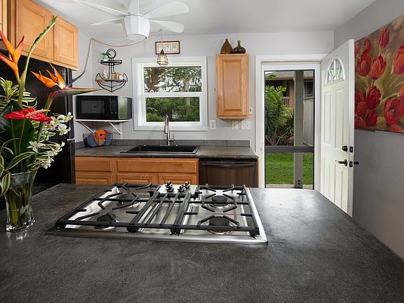Located in the heart of Kona, you'll find a beautifully remodeled one bedroom, one bathroom, ground floor condo at Kona Driftwood. You'll enjoy concrete counter tops with a Bosch 4-burner gas stove top and an oversized kitchen sink. The tiled floors create a consistency throughout the space. A few notable features include; all vinyl windows, new appliances, new ceiling fans, lights, bathtub/surround, bathroom vanity, full size washer with a stackable dryer. The front and back doors lead out to lanai space with a grassy yard.