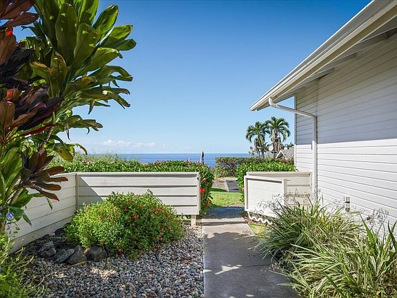 Private end unit at Pines I with an ocean view from your lanai. This 3b/2b unit with attached 2 car garage is the largest floor plan at the Pines and located at the end of a dead end street providing privacy to the South. The updated kitchen with granite counters and custom cabinets opens to the living room which has lots of natural light with two sliders opening to the courtyard. The living, kitchen, hallway have laminate wood floors and bedrooms have carpet. The two guest bedrooms share a bath with one room having a slider to a private courtyard. The primary bedroom is located on the opposite side of the house with a slider to the lanai and backyard. Located close to downtown Kailua Kona, grocery stores, shopping, beaches and restaurants this is an ideal location for your island residence.