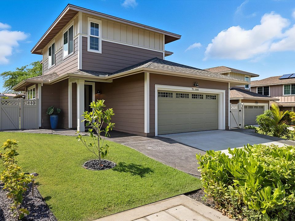Newly built in December 2024 and thoughtfully upgraded with chic customizations providing storage, organization, ease of living and aesthetic appeal, this Cottages On Alii plantation style home has been transformed to offer beachy charm at a fantastic value for the discerning Buyer. <br><br>A primary suite, kitchen with cabinet integrated appliances, family, living, powder and designated laundry rooms are on the ground level along with a 2 car garage. Upstairs are 3 bedrooms and a bath. Tall 9’ ceilings and 5’ windows create a bright and welcoming home. Split AC units make the interior a comfortable spot to retreat from the sun. The easy to maintain backyard is completely fenced. <br><br>Upgrades + Customizations <br>Carpet<br>Light fixtures<br>Dimmable lighting <br>Ceiling fans + fan lights<br>Custom wall coverings, window coverings and drapery<br>Custom California Closet built-ins in bedrooms, entry and family room<br>Designated workspaces in upstairs rooms<br>Owned solar, 26 panels, 2 batteries <br>Starlink WiFi<br>Exterior Extensions: stained concrete lanai and BBQ area, fencing + 2nd gate, stamped concrete driveway, custom stone finish entry<br>Kitchen Upgrades: Grohe faucet, water filtration system<br>Powder room: Custom wainscotting, wall covering + vanity with storage<br>Laundry room: butcher block folding counter, upgraded faucet and large capacity W/D<br>Garage: Ceiling storage, epoxy finished floor<br><br>Professionally landscaped with stately sealing wax palms, lime tree and tropical flowers.<br><br>Located in a fun and vibrant area by day, and perfectly positioned for peace and tranquility at night. Enjoy miles of walking/biking along Kona’s beach road, Alii Gardens Marketplace’s shops and food outlets next door, ocean access points across the street and some of Kona’s best beaches down the road. <br><br>Sold, furnished and move in ready. <br><br>Serviced by county sewer. $162 pr month HOA includes Roads, Common area Maintenance, and Trash Pick-up.