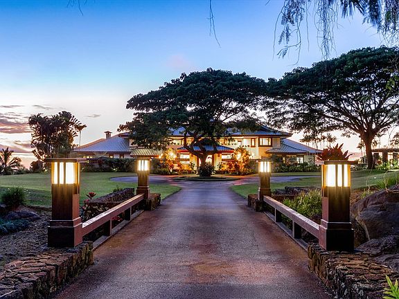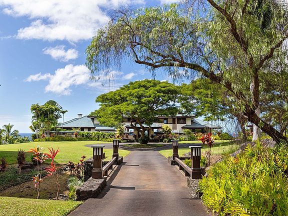 AUCTION: No Reserve. Open Daily 1 PM- 4 PM & By Appointment. Behind the rich wood doors of Highway, you can escape to your very own slice of Big Island paradise. A lantern-lit entrance and tranquil koi pond will mesmerize as you traverse a "floating" bridge and cross under the tropical canopy and lush citrus trees leading to the grand entrance. Designed by renowned architect Lucky Bennett, this exquisite estate features pocketed doors throughout, converting interior spaces into expansive living areas. The main living space greets you with two walls of glass that open, providing sightlines and cross breezes from the incredible Kona coastline. Entertain, enjoy alfresco meals, or revel in intimate sunsets from your breathtaking terrace. An ideal spot to welcome guests, you'll love your private master wing and two guest suites with private entrances and terrace access. From your elevated perch on Mount Hualalai, situated in the world-famous Kona Coffee Belt, you can marvel at almost ten acres of emerald green and the ocean beyond.