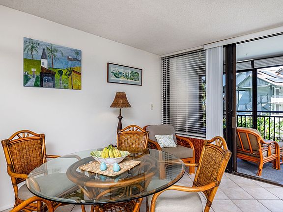 This is a STVR certified, incredibly spacious one bedroom, two bathroom condo sold fully furnished. There are tile floors throughout the living spaces and large glass doors lead you to an inviting lanai (patio) space to enjoy the Hawaiian breezes, morning coffee, or dinner with family. Coastal storm shutters are installed on the patio for peace of mind when away from your home for long periods of time.