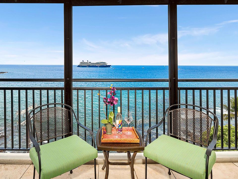 Almost oceanfront condo located across from the ocean seawall in historic downtown Kailua town. Enjoy the beauty of the breathtaking ocean view near the sundrenched sand near the Kailua pier. Own a condo in one of the favorite vacatithe on destinations in Hawaii. Gaze at the sunset all year long from the lanai on the 6th floor. Whale watching in season is your favorite pastime. Premier place to watch holiday parades. Since this is an end unit you can peek around the corner and see mountain with sunrise part of the year.<br><br>This one bedroom turnkey furnished condo has two bathrooms and a Murphy bed. Two large TV's make for a happy family.<br> <br>This comfy condo has been used as a second home since 2013. Currently this condo is not in vacation rental but the complex is currently in a "Resort Hotel" area.<br><br>Kitchen remodel in 2013 included new appliances, granite countertops and tile floors. The reverse osmosis water even goes to the ice maker. Bathrooms remodel included new cabinets with granite countertops. There is bamboo flooring in the living area and bedroom. <br>The complex amenities include a larger than normal pool, BBQ area, rooftop deck, locked lobby elevator and 1 parking space.<br>Shopping, restaurants and coffee shops are close by.